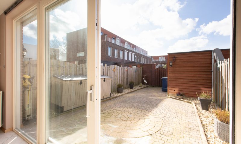 Achter de woning is er een gemeenschappelijk en afgesloten binnenterrein waar de kinderen veilig zonder autoverkeer kunnen buitenspelen.