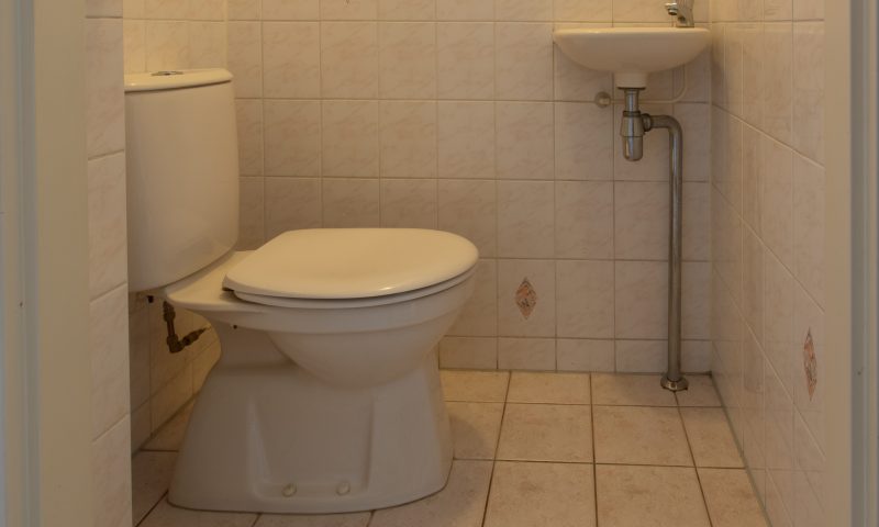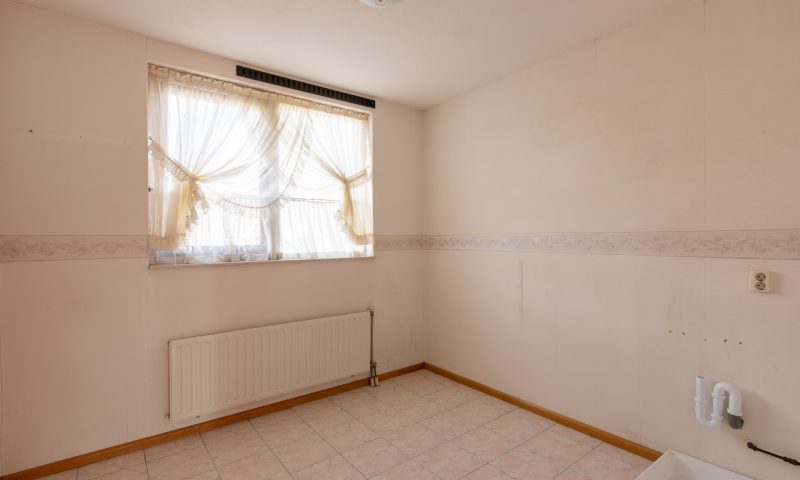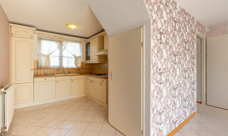 The front garden leads to the entrance, which has a glass canopy above the door. Upon entering, you arrive in the hallway with a meter cupboard, a toilet room (including a standing toilet and sink), a staircase to the first floor, and access to the living room with a semi-open kitchen. Under the stairs, there is a storage cupboard.