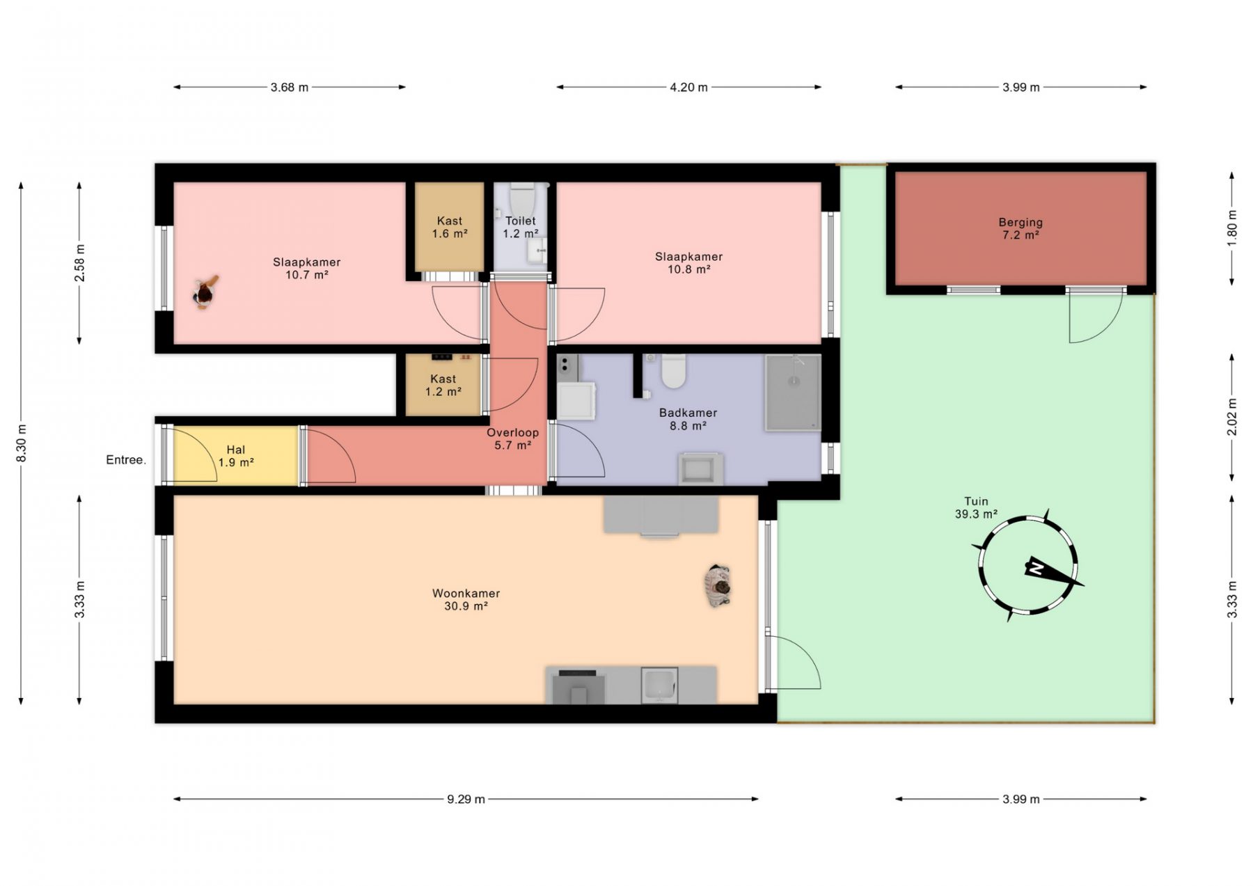 Entree: voordeur naar hal met tochtdeur, gang die toegang biedt tot de volgende ruimtes: doorgebroken woonkamer (voormalige ensuite) van 31 m2 met open keuken, ruime badkamer van 9 m2, separaat toilet, twee slaapkamers van beiden ca. 11 m2 en een meterkast. De slaapkamer aan de straatzijde biedt toegang tot een ruime kledingkast. Via de keuken kom je in de tuin van ca. 40 m2 met stenen berging van ca. 7 m2.