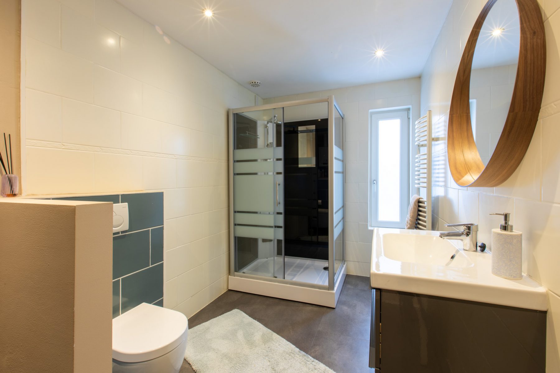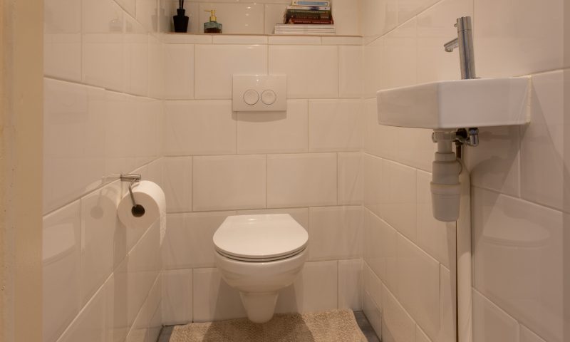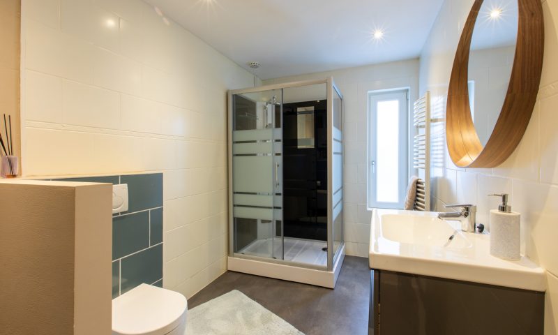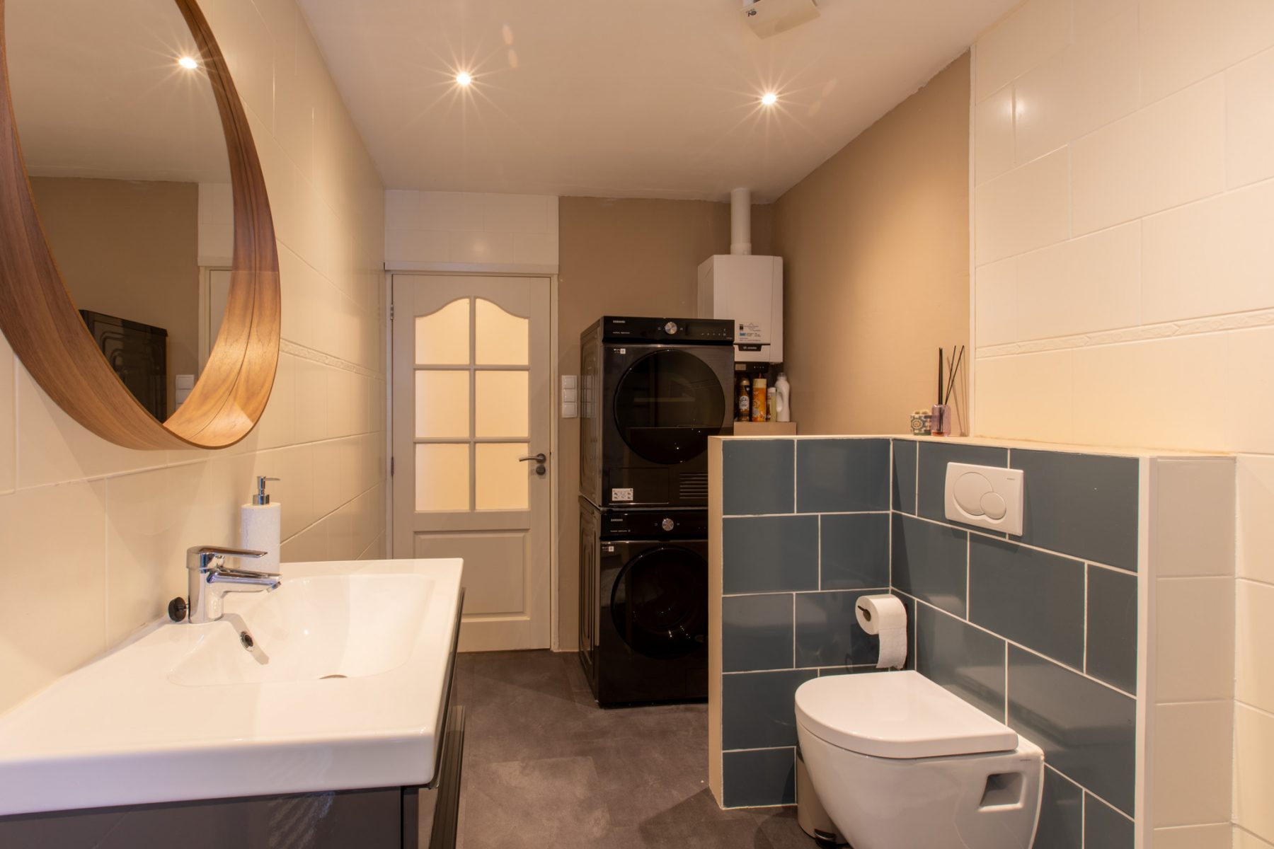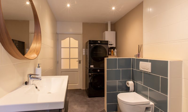 De badkamer is voorzien van een douchecabine, wastafel, een (tweede) hangend toilet, designradiator en opstelplaats voor de c.v.-ketlel, wasmachine en droger.
