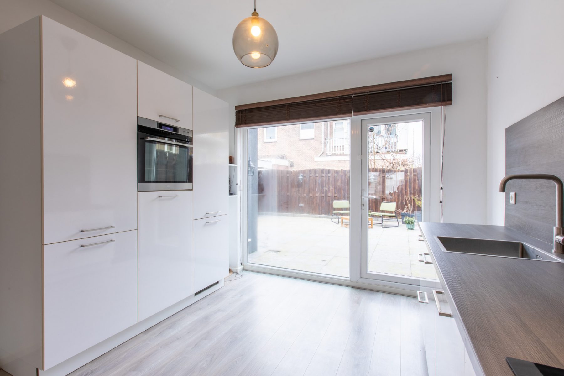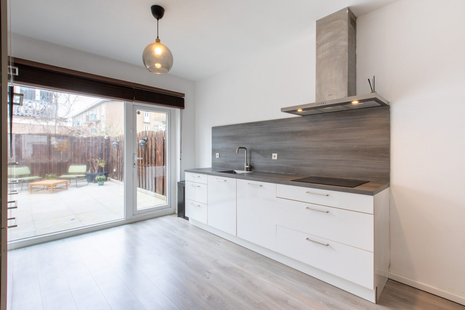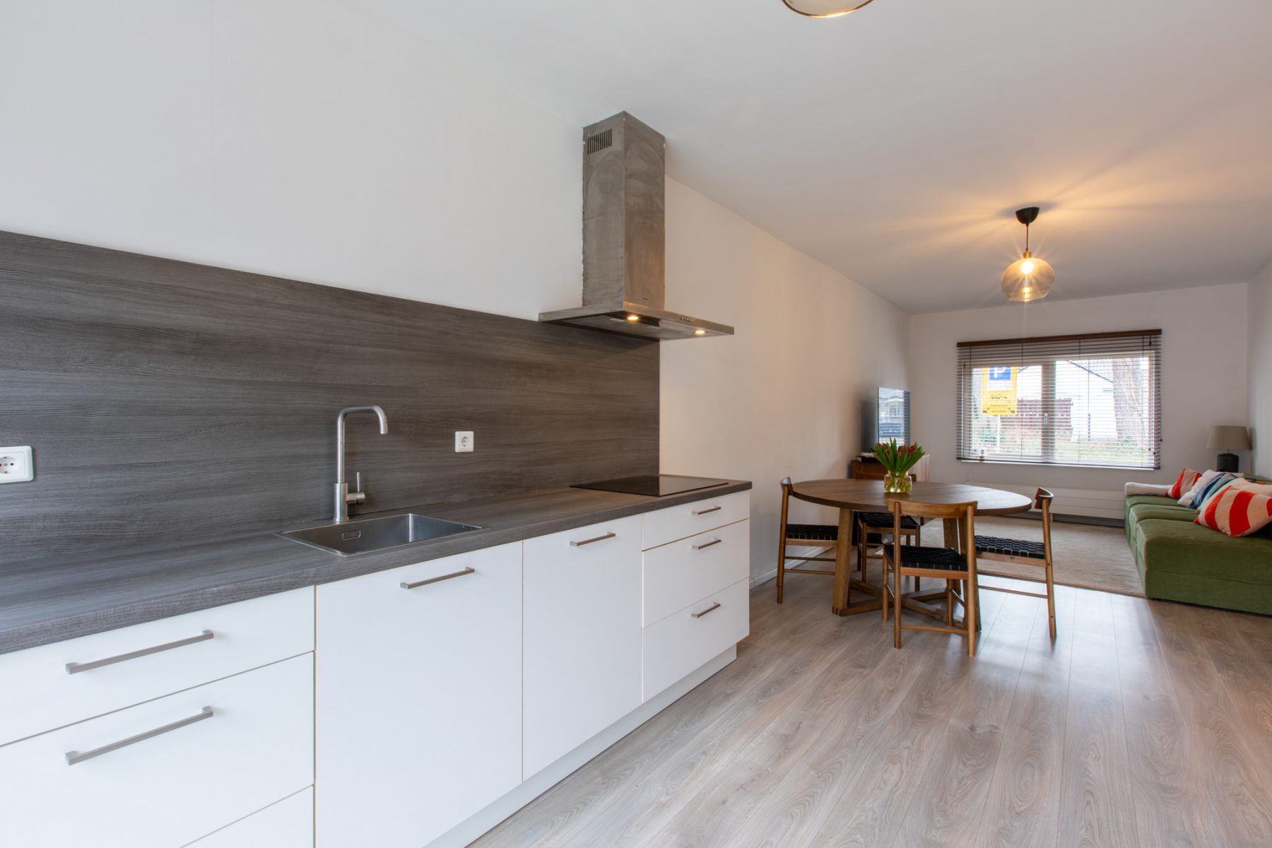 De keuken is voorzien van de volgende inbouwapparatuur: inductiekookplaat met brede afzuigkap, stoomoven, vaatwasser en koel-vriescombinatie.