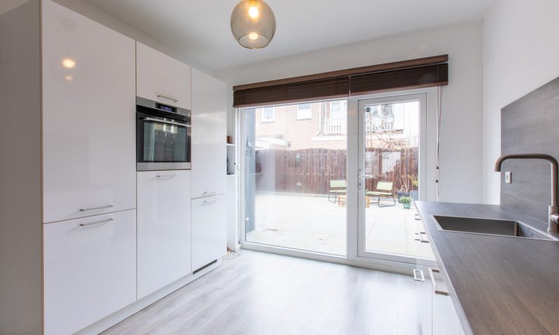 The bathroom features a shower cabin, washbasin, a (second) wall-mounted toilet, designer radiator, and space for the central heating boiler, washing machine, and dryer. The kitchen is equipped with the following built-in appliances: induction hob with wide extractor hood, steam oven, dishwasher, and fridge-freezer combination.