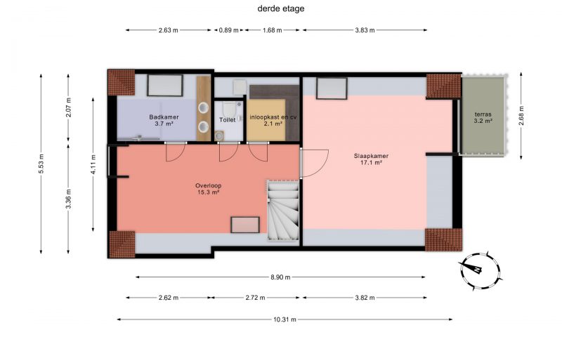 Derde etage: Overloop met toegang tot de tweede badkamer voorzien van inloopdouche en dubbele wastafel, een derde toiletruimte voorzien van een hangend toilet en fonteintje, een ruime inloopkast met opstelplaats voor de c.v-ketel uit 2021, en een ruime achterslaapkamer van 17 m2 met toegang tot een tweede dakterras.