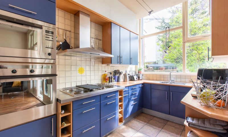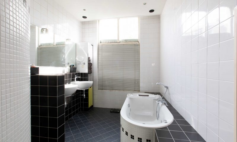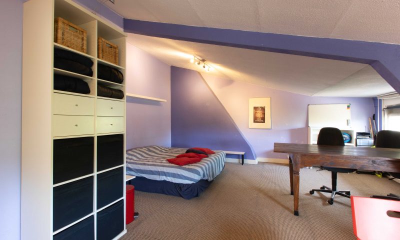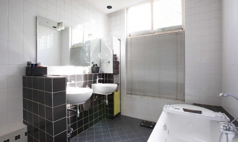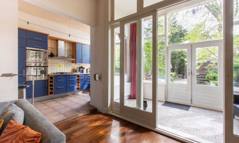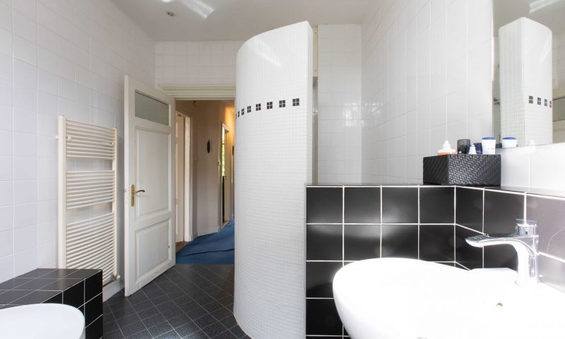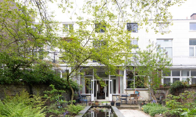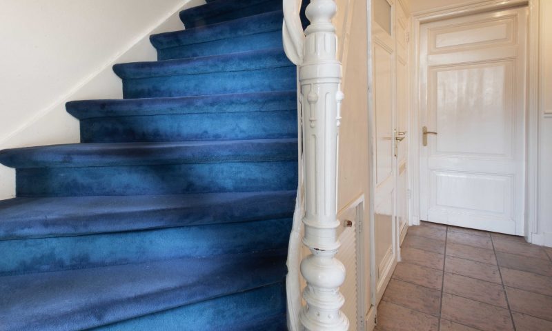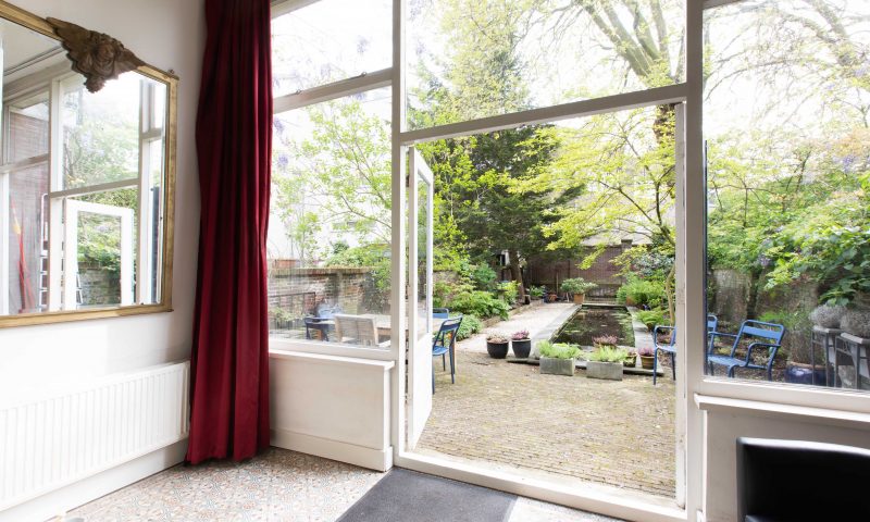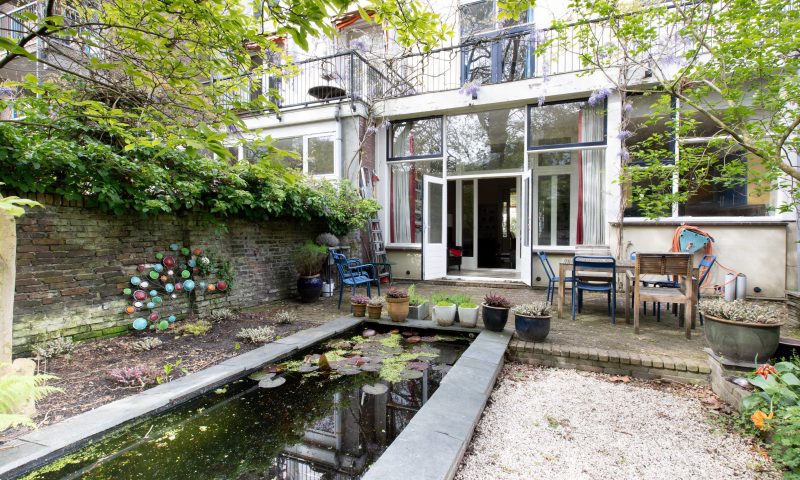 Through the front door, you enter the hall with the meter cupboard. Then you arrive via the draft door in the hallway, which provides access to the living “room en suite”, utility room, toilet, 8 m2 cellar, and stairs to the first floor. The en suite room is rich in original features, such as the sliding doors with stained glass, ornamental ceilings, stained glass windows, and a parquet floor. From the back room, you have access to the kitchen and the conservatory. The kitchen is equipped with all kinds of built-in appliances such as a refrigerator, 5-burner gas stove with extractor hood, oven, microwave, and dishwasher. You also have access to the utility room from the kitchen. The conservatory, with a floor of classic Portuguese azulejos, is a pleasant place to stay during the winter months. Sunlight warms this space, and the view of the deep backyard with pond is truly enchanting. The 115 m2 garden is an oasis of tranquility and is low maintenance with small trees, shrubs, and ferns.