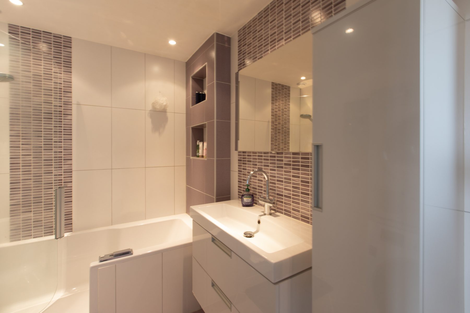 * badkamer met ligbad, wastafel en aansluiting voor wasmachine en droger,