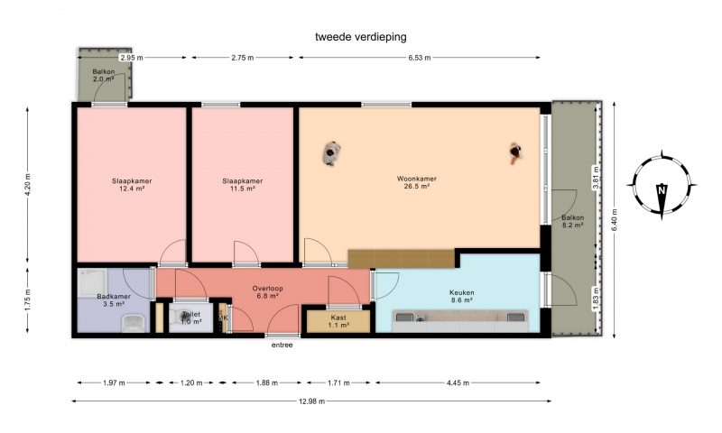 – two large bedrooms (12.4 m² and 11.5 m²),