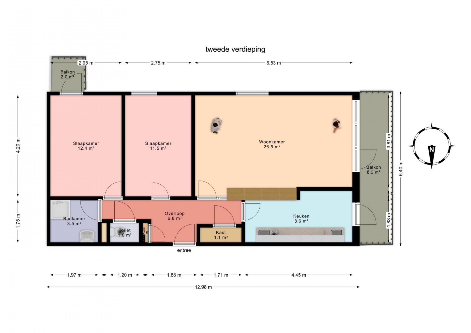 – two large bedrooms (12.4 m² and 11.5 m²),