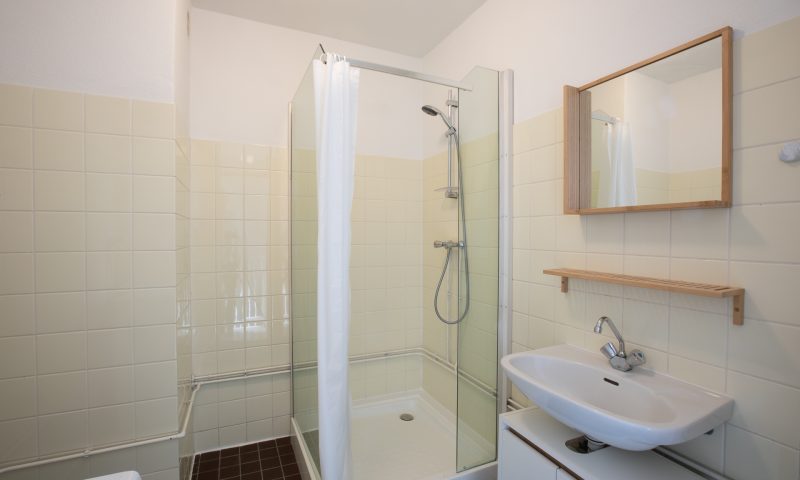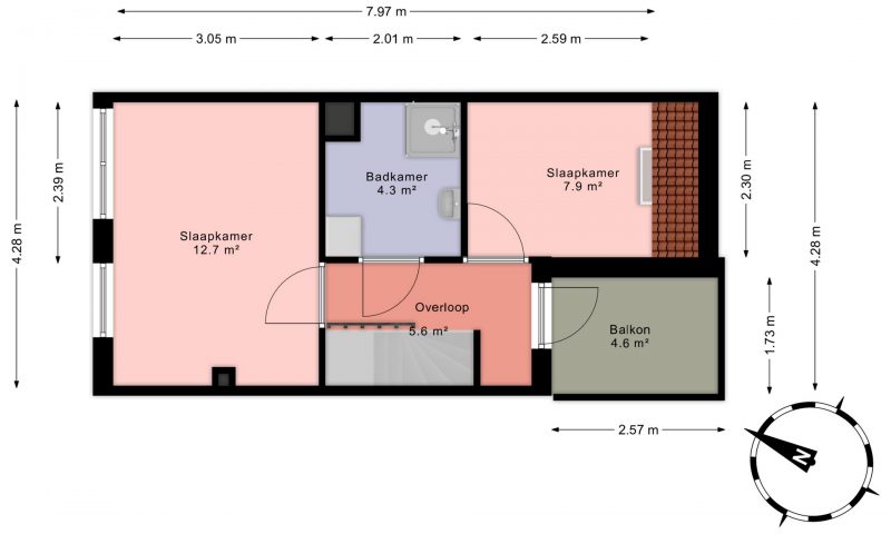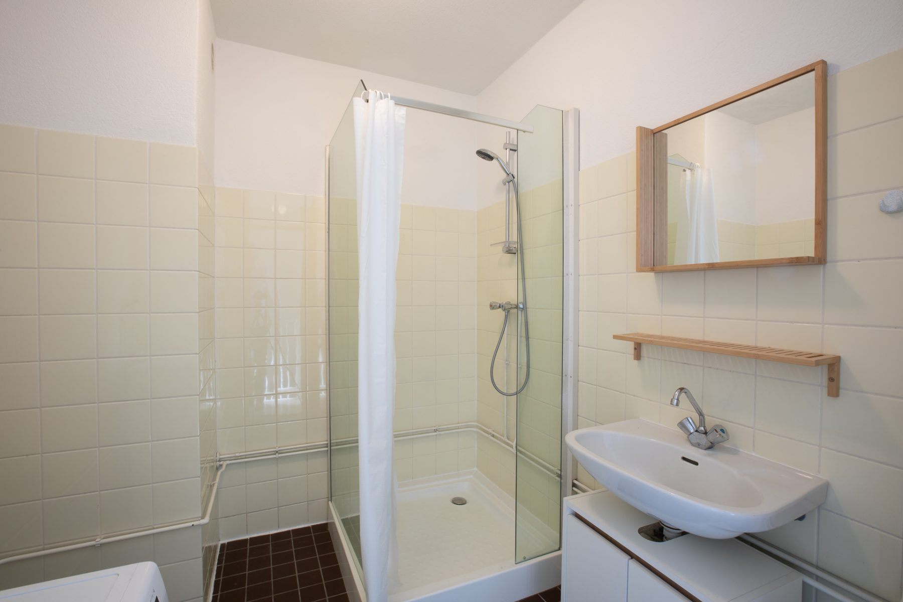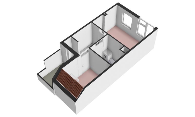 Second floor: The landing provides access to a master bedroom, a second bedroom, and a spacious bathroom with shower cabin, sink, and space for a washing machine. Also on the landing, there is a cupboard housing the central heating combi boiler. From the landing, you also access the sunny roof terrace (5 m²) facing south.
