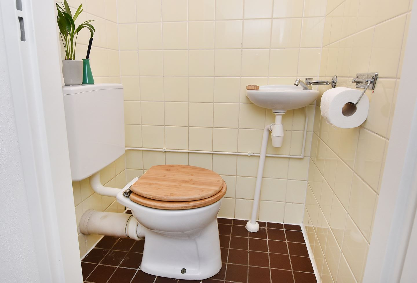 First floor: From the gallery, with a pleasant view of the park, you reach the front door. Inside, the hallway connects to the kitchen, living room, toilet, fuse box, and staircase. The kitchen is equipped with a gas hob, extractor hood, and refrigerator. The toilet has a hand basin.